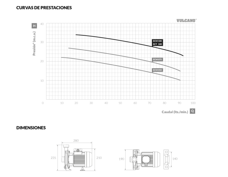 Bomba centrífuga elevadora ECM-100 Vulcano. De 1.00HP y tensión monofásica de 220V-50 hz, diseñada para elevar fluidos de una zona de menor presión a otra de mayor altitud en sistemas de agua potable, sistemas de riego, sistemas de calefacción y refrigeración.