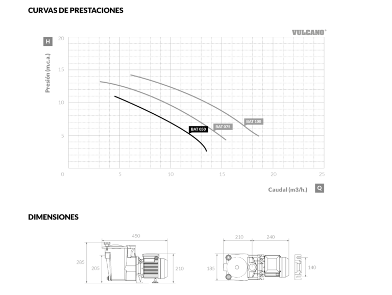 Bomba autocebante para piscina BAT 050 Vulcano. Diseño tradicional. Cuenta con un canasto atrapa hojas amplio y sistema de tapa tipo mariposa de rápida apertura con un ¼ de giro.