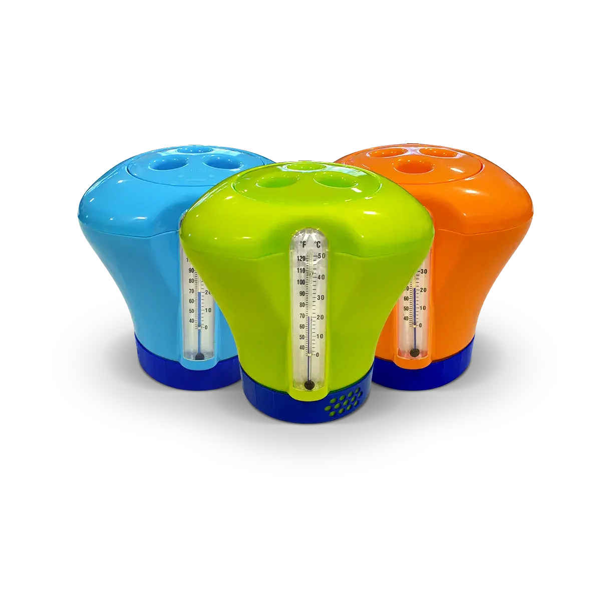 Boya dosificadora de cloro Vulcano con termómetro, para pastillas de 50 y 200 g. La boya dosificadora flota sobre la superficie de la piscina conteniendo pastillas de cloro de disolución lenta o triple acción que, al al entrar en contacto con el agua, se disuelven lentamente.