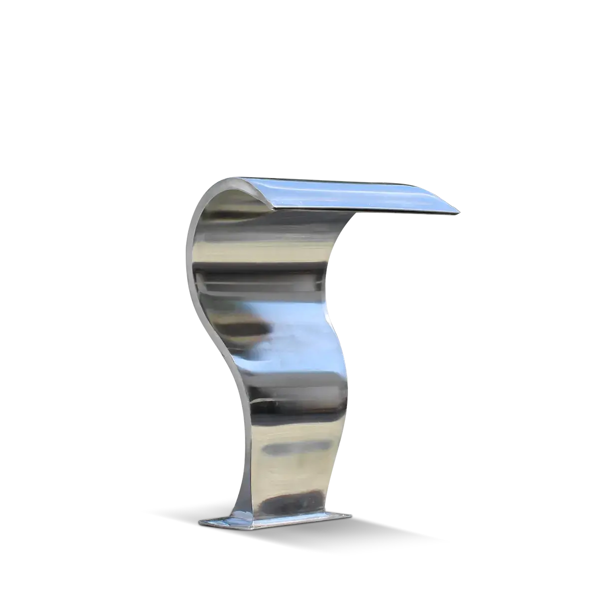 Cascada volumétrica Vulcano. Fabricada de AISI 304, pensada para ser colocada en la vereda con altura de 47 cm. Genera una lámina de agua vistosa y continua de 35 cm de ancho hasta el espejo de agua. Su terminación pulido brillante destaca y ofrece un distintivo ornamental para su piscina.