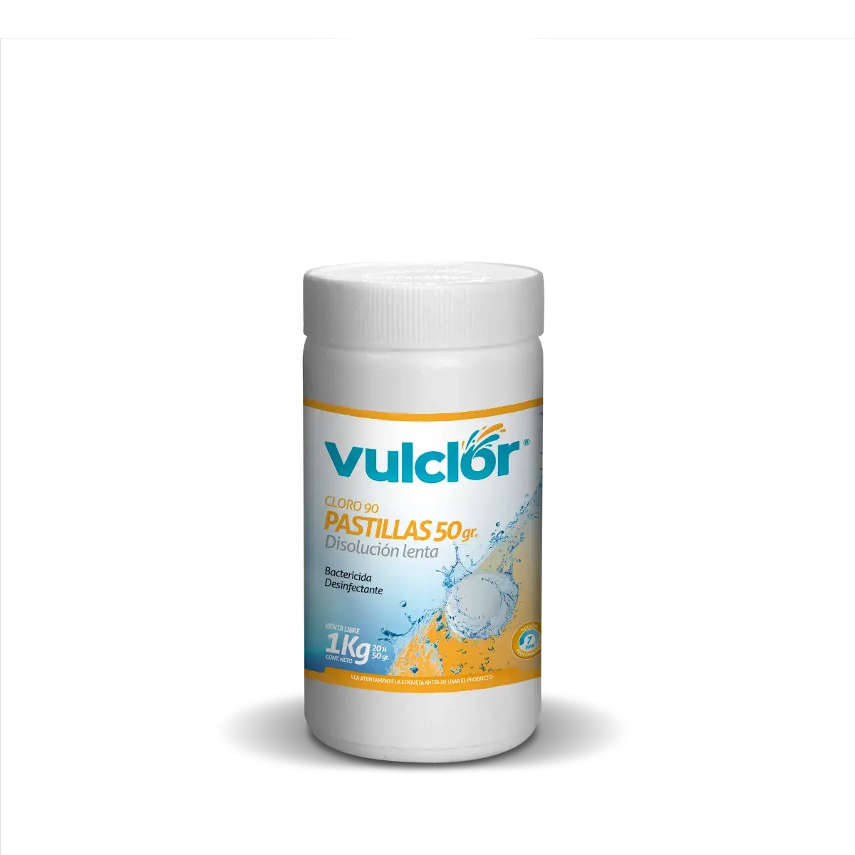 Cloro en pastillas Vulcano x 50 g (1 kg). Eficaz bactericida de disolución lenta con alto poder desinfectante. FÔcil y prÔctico de utilizar, es ideal para dosificadores o boyas flotantes. No incrementa la alcalinidad del agua, se mantiene estable ante la acción del sol y es de alto poder residual.