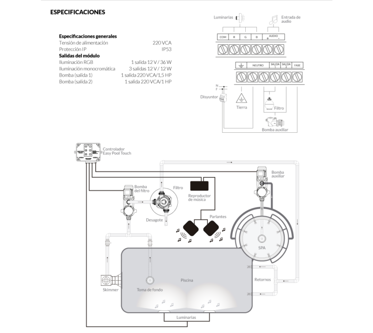 Easy Pool Touch Vulcano. Controla todas las funciones de la piscina desde el módulo de comando o mediante su control remoto resistente al agua. Además permite controlar las luces de la piscina, sincronizar las luces con señal de audio y controlar el encendido y apagado de la bomba del equipo de filtrado más una bomba auxiliar.