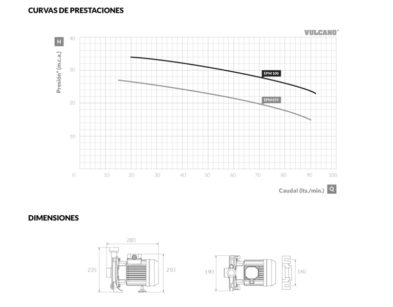 Bomba presurizadora EPM-100 Vulcano. De 1HP y tensión monofásica de 220V-50Hz, con presión de arranque de 2.2 kg/cm². Este equipo optimiza, regula y controla la presión de las tuberías en instalaciones, provisto con "presscontrol" para automatizar su funcionamiento. Su fácil instalación, larga vida útil y bajo mantenimiento, hacen de este producto un referente dentro del mercado.