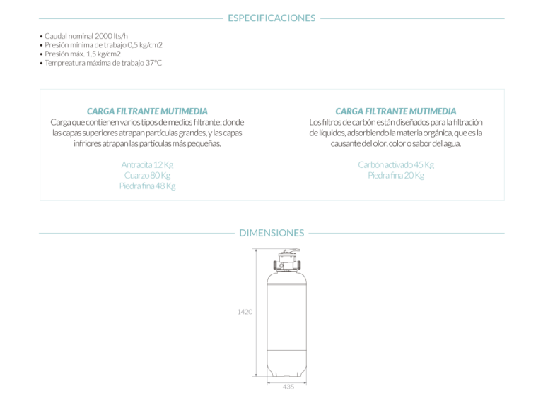 El equipo puede utilizarse con carga filtrante multimedia, para eliminación de sedimentos o con carbón activado, para eliminar los problemas de mal olor y sabor relacionados con la presencia de cloro residual presente en el suministro de agua potable de red.
