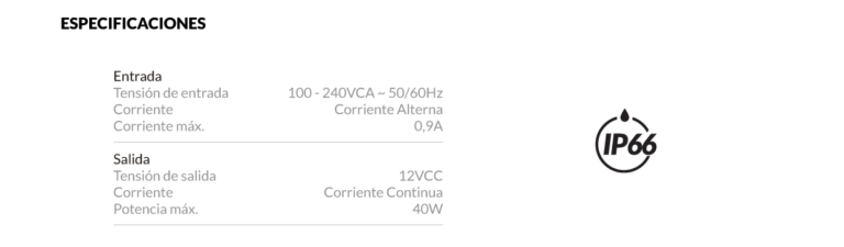 Fuente de alimentación Vulcano de 12V y 40W para alimentar luminarias LED para piscinas. Permite transformar la energía eléctrica que alimenta al sistema de iluminación de la pileta, reduciendo la tensión y rectificando el voltaje de corriente alterna (VCA) a corriente continua (VCC). Desarrollada con la mejor tecnología, brinda corriente de salida estabilizada, son 100% resinados logrando nivel de protección IP66, protegiendo sus componentes internos de la humedad y de salpicaduras de agua.