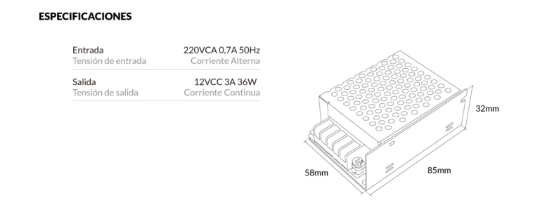 Fuente Switching Vulcano 12V 3A (36W) para alimentar luminarias LED. Permite transformar la energía eléctrica que alimenta al sistema, reduciendo la tensión y rectificando el voltaje de corriente alterna (VCA) a corriente continua (VCC).