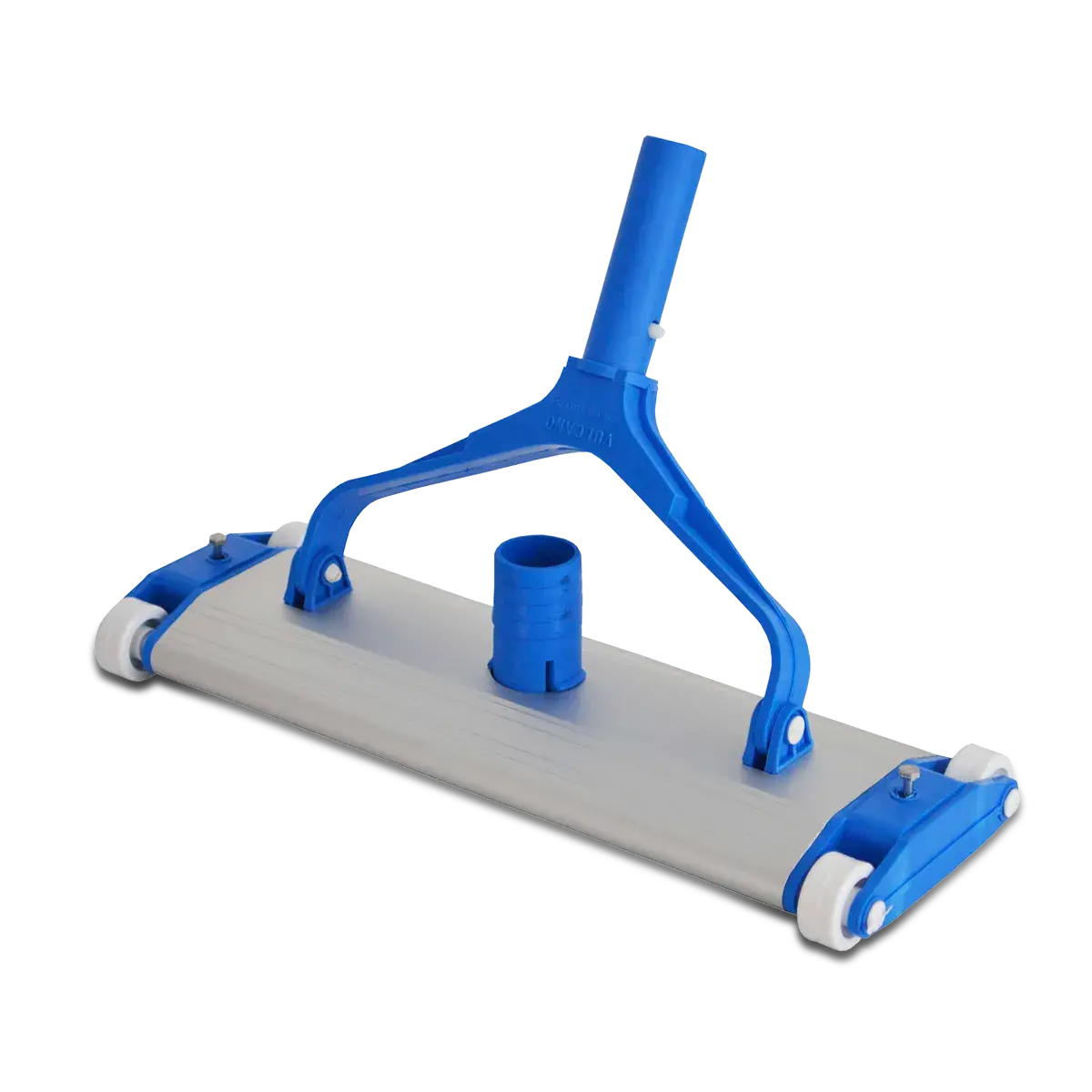 Limpiafondo de aluminio 35cm Vulcano. Dispositivo para aspirar suciedad y residuos depositados en el fondo de la piscina. Para utilizarlo, se debe conectar la manguera flotante al acople de aspiración y un mango fijo o telescópico.