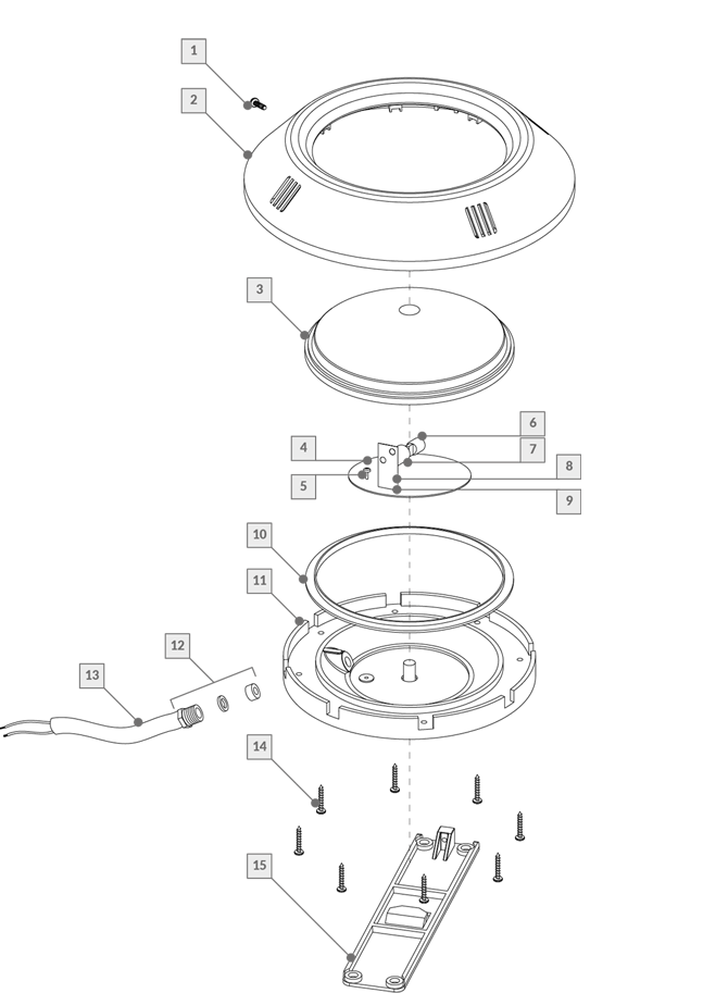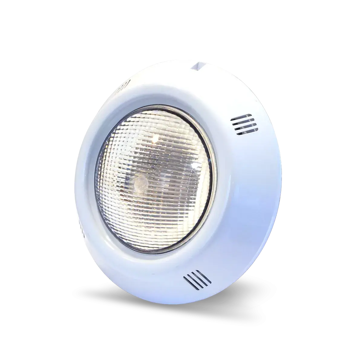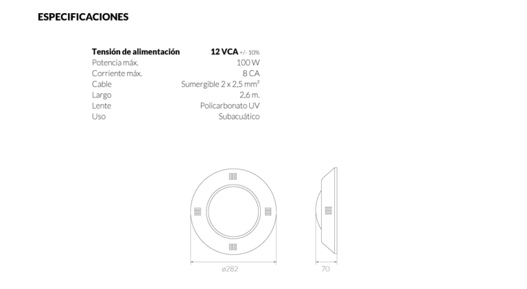 Luminaria Bipin subacuática Vulcano para adosar en hormigón y fibra de vidrio. Posee cuerpo de plástico ABS, lente de policarbonato estriado, lámpara halógena BiPin de 100W que opera con tensión de 12V. Incluye pasamuro para adosar en hormigón.