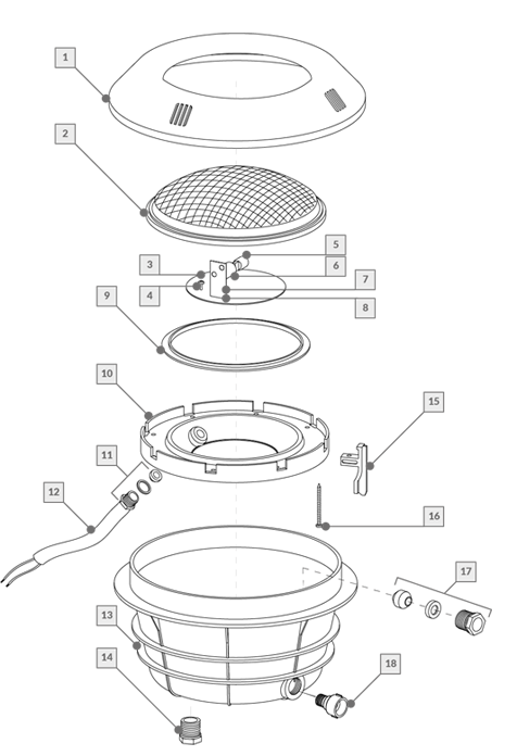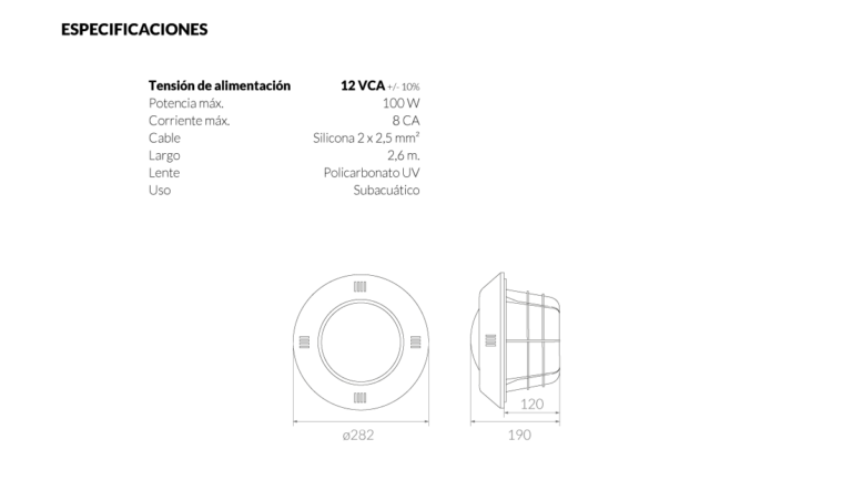 Luminaria Bipin subacuática Vulcano para embutir en hormigón. Posee cuerpo de plástico ABS, lente de policarbonato estriado, lámpara halógena BiPin de 100W que opera con tensión de 12V.