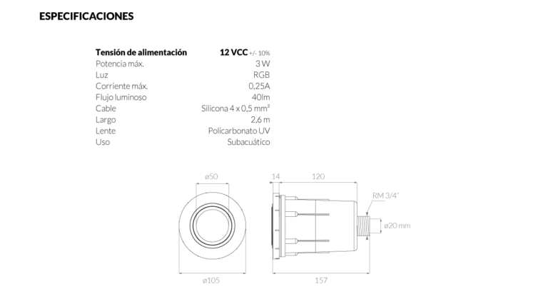Luminaria Spot subacuática Vulcano con aro cromado para embutir en hormigón. Posee Placa de 12 LEDs RGB de 3W que opera con tensión de 12V.