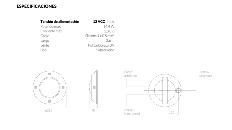 Luminaria subacuática Vulcano para adosar en hormigón y fibra de vidrio. Con cuerpo de plástico ABS y lente de policarbonato rugoso. Posee Una placa de 28 LEDs RGB con potencia de 14,4W que opera con tensión de 12 VCC. Incluye pasamuro para adosar en hormigón.