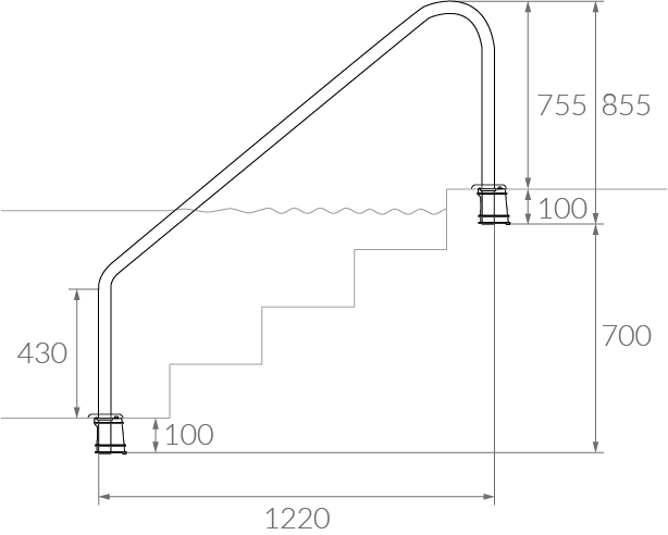 Pasamanos Vulcano largo para 4 escalones. Fabricado de acero inoxidable 304, tiene un diámetro ø38,1 mm y terminación pulida brillante. Sólo para piscinas de hormigón. Es un accesorio auxiliar que correctamente ubicado y fijado, permite realizar movimientos cómodos y seguros dentro de la piscina.