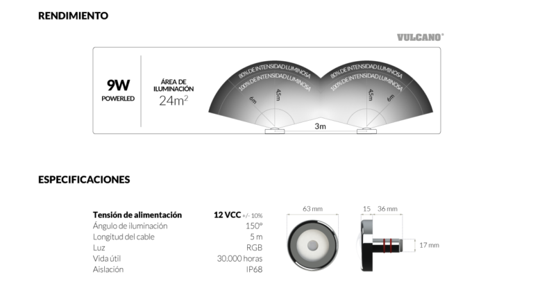 Luminaria subacuática PowerLED Vulcano 9W de luz RGB 12 VCC con cable de 5 m. Con ángulo de apertura de 150°, brinda excelente potencia de iluminación con niveles muy bajos de consumo energético.
