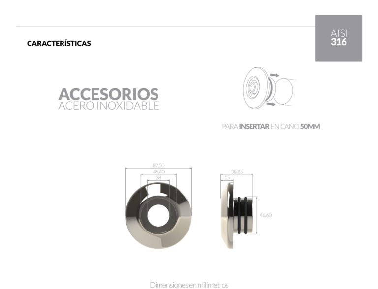 Virola AISI 316 Vulcano. Fabricada de aero de inoxidable AISI 316 macizo y acabado pulido brillante, otorga una terminación diferencial en piscinas de hormigón; es utilizada como punto de succión en donde se conecta la manguera de aspiración de limpiafondo. Su sistema de fijación para insertar en caño de PVC ø50 mm (Clase 6), permite fácil colocación al finalizar la obra de la pileta, incluso después de la colocación del revestimiento.